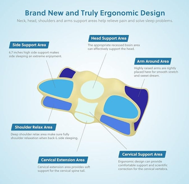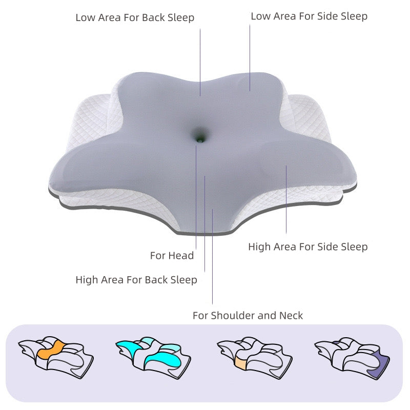 تم تصميم سطح الوسادة وجوانبها لتناسب أوضاع النوم المختلفة، ويمكن أن تناسب الرأس جيدًا، بحيث يكون العمود الفقري العنقي أثناء النوم مريحًا تمامًا، وتصميم فريد لوضعية تركه، بحيث تكون الأكتاف أكثر راحة، حتى تتمكن بسرعة في نوم عميق